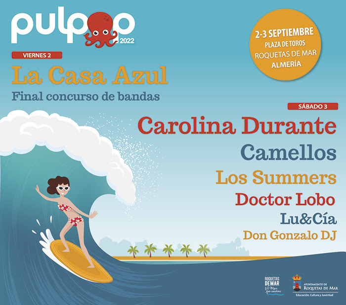 La Plaza de Toros de Roquetas de Mar (Almería) acogerá los días 2 y 3 de septiembre la décimo sexta edición del Pulpop Festival 2022. La organización acaba de anunciar el cartel definitivo confirmando la presencia de La Casa Azul y la final del concurso de bandas emergentes en la jornada del viernes, y los madrileños Carolina Durante, Camellos, Los Summers, Doctor Lobo, Lu&Cía y Don Gonzalo DJ qué actuarán la noche del sábado.