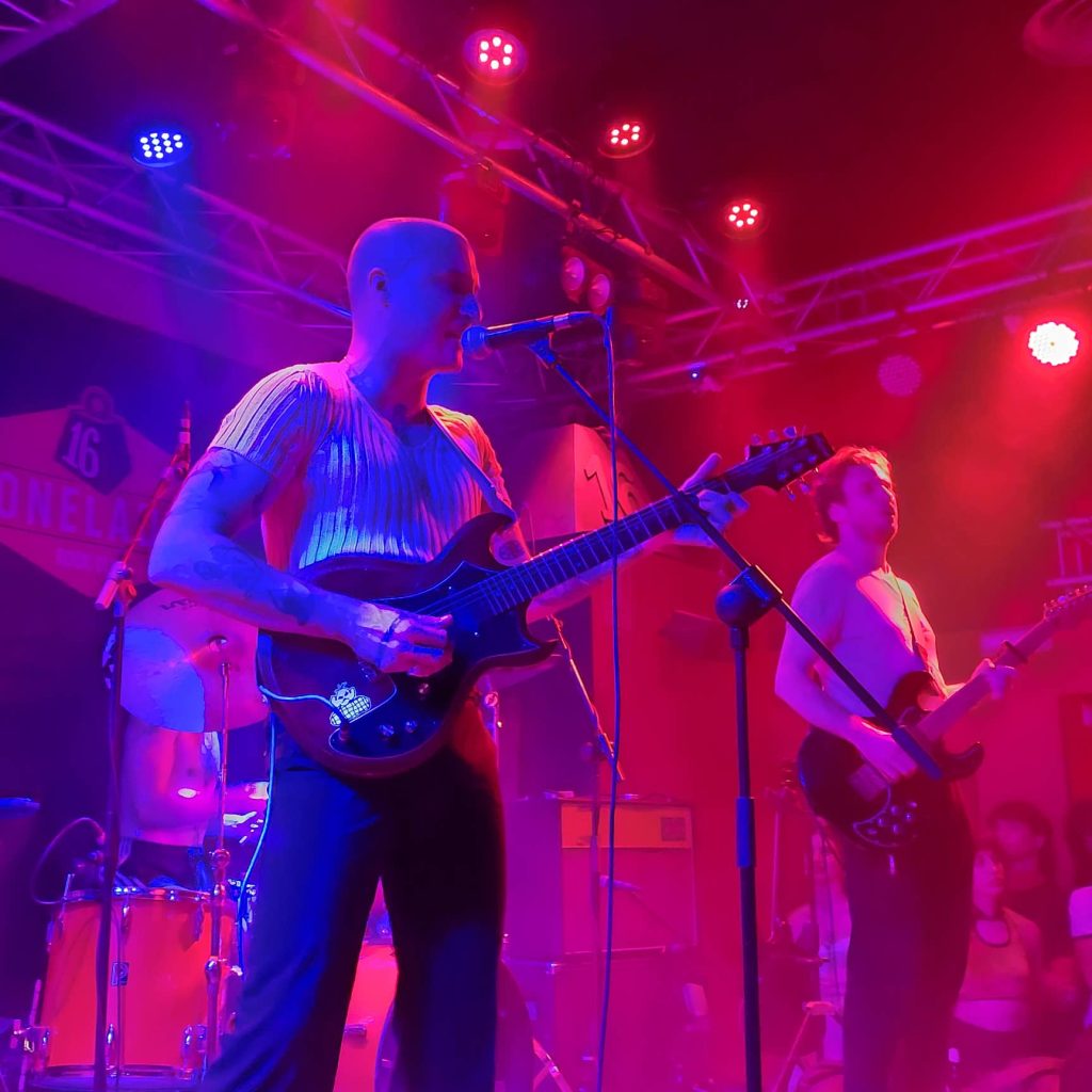 Oscuro, rotundo, magnético, intenso, demoledor, así es el sonido con el que nos iba a engullir la siguiente banda en entrar en escena: Mausoleo. Se notaba la expectación entre el público, y es que este trío surgido en Valencia llevaba sin pisar los escenarios de la ciudad de Valencia 8 meses, y durante todo el concierto quedó más que patente la entrega de la audiencia ante la liturgia sonora de Mausoleo. “Paredón”, tema incluido en su álbum de 2020 “Absolución”, dió el pistoletazo de salida con esa guitarra súbita y sumergiéndonos ya de lleno en esa atmósfera contundente entretejida por la oscuridad y unas letras hirientes, que continuó con “Mentiré” y los riffs de guitarra macabramente arrebatadores de “Inherente”. Con “En el final” llegó uno de los grandes temas de la banda, porque ¿qué seguidor de Mausoleo no ha coreado como si le fuera la vida en ello aquello de “Yo me fui con dolor, sigo igual y sin ti. Ayer vi más allá y creí sonreír”? Todo un mantra catárquico para liberarse del vacío que dejan la decepción y el desengaño, tras el cual vino un tema instrumental donde los 3 integrantes de la banda se dejaron la piel para brindarnos un momento de gran contundencia.