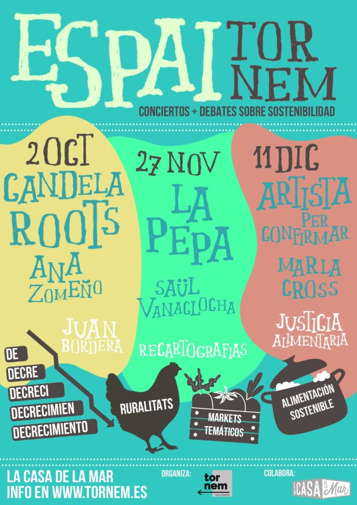 Espai Tornem es un nuevo ciclo que contará con tres fechas este 2022. El objetivo principal de Espai Tornem, es crear un lugar de sensibilización sobre el impacto humano en el medio ambiente y la necesidad de adoptar modelos de vida sostenibles comprometidos con la conservación. En definitiva, quiere posicionarse como alternativa de ocio enfocada a la concienciación y divulgación de modelos de vida sostenibles a través de encuentros con especialistas, artistas de todo tipo y música en directo.