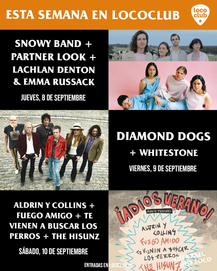Loco Club retoma sus citas con artistas internacionales. Visitarán la sala las bandas australianas de pop Snowy Band, Partner Look y el dúo compuesto por Lachlan Denton y Emma Russack. Además, recibirán a los míticos Diamond Dogs con nuevo trabajo. Celebrarán también la despedida del verano con bandas locales de la mano de Carcosa Records, participando Fuego Amigo, Te Vienen a Buscar los Perros, The Hisunz y Aldrin y Collins.