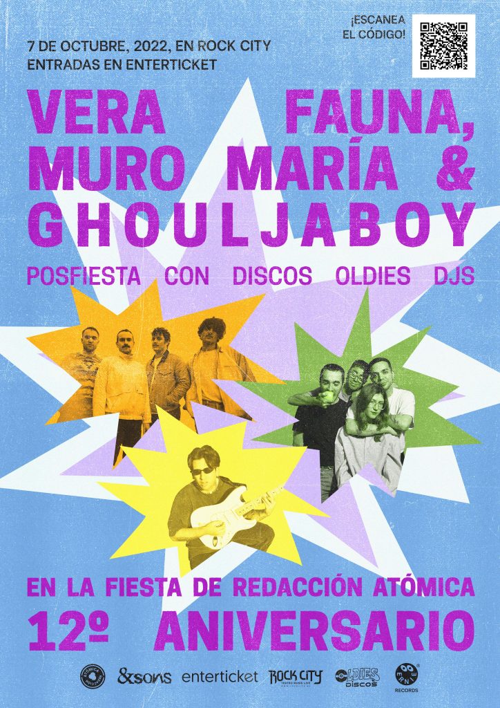 Redacción Atómica celebra sus 12 años de vida el próximo 7 de octubre. El escenario elegido para la ocasión es la maravillosa sala Rock City y la música irá a cargo de los sevillanos Vera Fauna y su adictiva luminosidad, de la joven banda alicantina Muro María con su fascinante garaje rock y de Ghouljaboy con su dreamcore con el que abraza el city pop más playero.