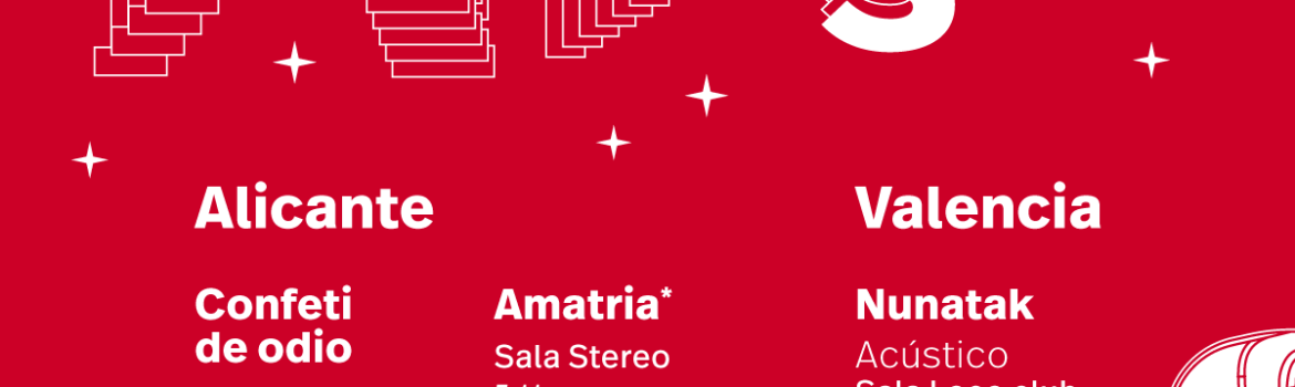La inauguración de los directos será el próximo jueves 29 de septiembre con el acústico de Nunatak en Loco Club de Valencia (gratuito), al que seguirá Sanisidro (6 de octubre en 16 Toneladas, Valencia (gratuito). A partir de noviembre, el ciclo viajará hasta Stereo Alicante con Confeti de Odio (4 de noviembre, gratuito), Amatria (5 noviembre), Karavana (26 de noviembre) y La Plata (9 de diciembre, gratuito).