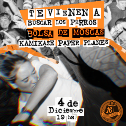 Los valencianos Te Vienen A Buscar Los Perros vuelven a presentarse en su ciudad natal. En esta ocasión lo harán en la conocida sala 16 Toneladas y estarán acompañados por las bandas Bolsa de Moscas (Extremadura) y Kamikaze Paper Planes (Valencia).