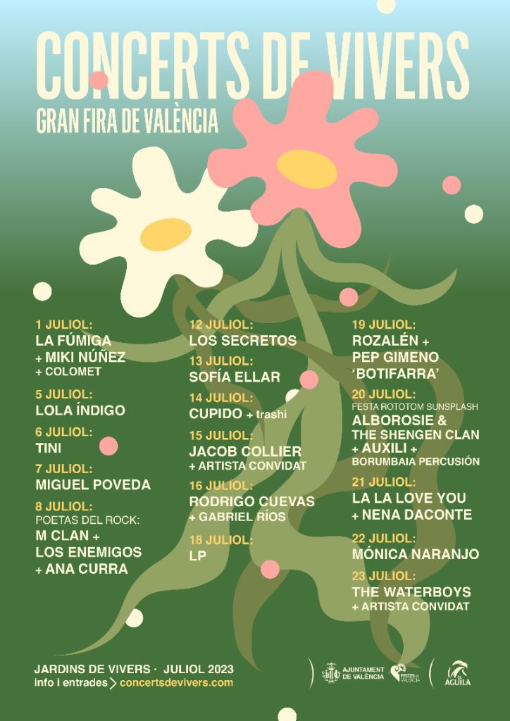 La próxima edición de los Conciertos de Viveros también contará con La La Love You. Los madrileños acumulan numerosas distinciones en los últimos años gracias al pop fresco de estribillos pegajosas de canciones como “El fin del mundo”, “Big Bang” o la más reciente “El principio de algo”. El grupo tocará el viernes 21, jornada en la que también estará Nena Daconte, proyecto de Mai Meneses que presentará el álbum Casi perfecto. La vocalista Mónica Naranjo, quien presentaba el Benidorm Fest hace unos días, también formará parte de la Gran Feria de València. Lo hará el sábado 22. La intérprete catalana sigue con la gira Mimétika donde continúa demostrando que es una de las mejores cantantes del país. Finalmente, los escoceses The Waterboys, formación de reconocida solvencia en directo, se encargarán de poner el broche final a los Conciertos de Viveros el domingo 23 de julio con sus clásicos y los temas de su último trabajo, All Souls Hills.