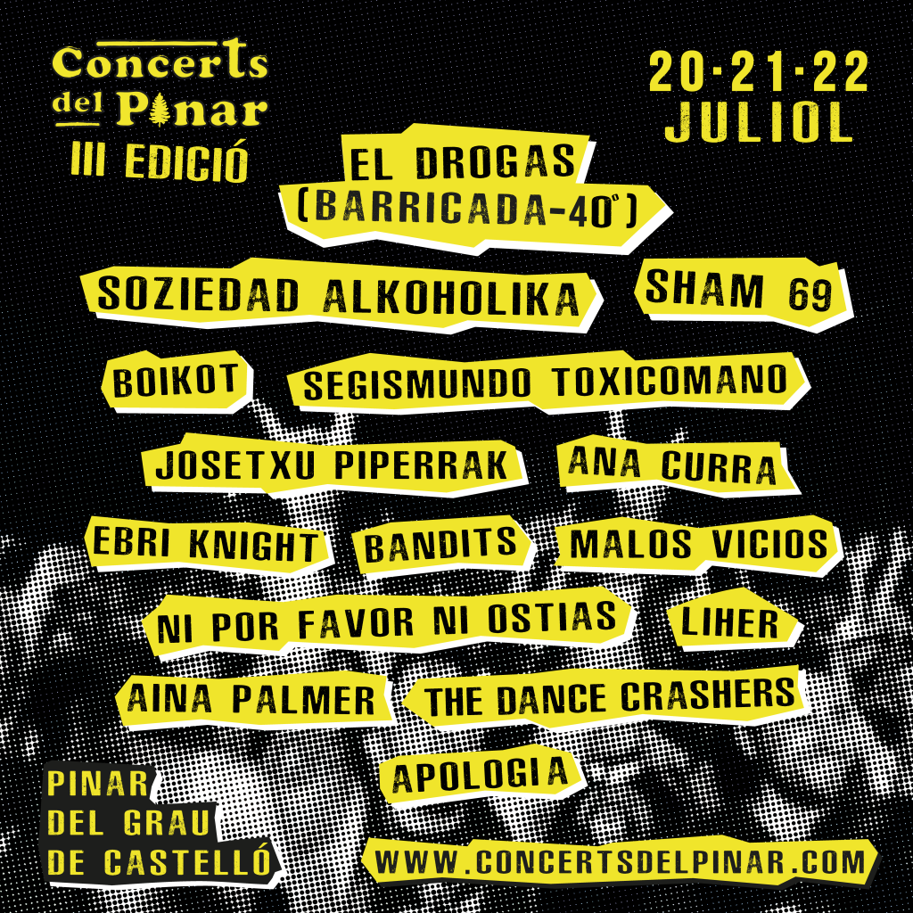 La tercera edición de Concerts del Pinar tendrá lugar al Grao de Castelló los próximos 20, 21 y 22 de julio. Esta vez el festival punk-rock de las comarcas de la provincia de Castellón da a conocer todo su cartel encabezado por El Drogas, dentro del cuarenta aniversario de Barricada, con casi toda su banda y su repertorio original. Asimismo, también protagonizarán la tercera edición de Concerts del Pinar grupos míticos del punk rock estatal como Soziedad Alkoholika, Boikot, Segismundo Toxicomano o Josetxu Piperrak, entre muchos otros. Es necesario destacar también la presencia de los ingleses Sham 69, mítica banda de punk de los años 70. A partir de hoy los abonos estarán disponibles por tiempo limitado a un precio especial de 40 €.