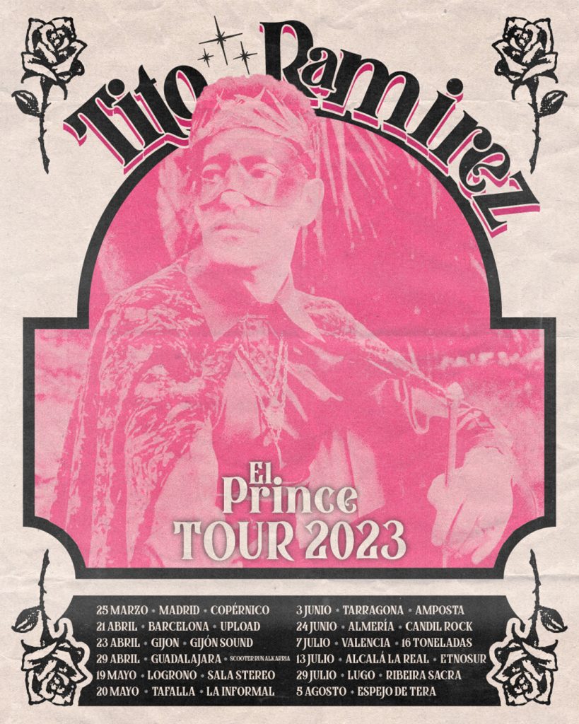 Después de 5 singles y un LP publicados, nos llega al fin el esperado segundo trabajo en larga duración de Tito Ramírez, titulado “El Prince” (2023, El Volcán Música & Discos Antifaz). Su excelentísima perversidad vuelve el próximo 24 de febrero a conquistar el trono de su propio universo sonoro, profundizando y ampliando su abanico estético con nuevos sonidos y ritmos, con los que ha experimentado por primera vez antes no desarrollados por el artista.