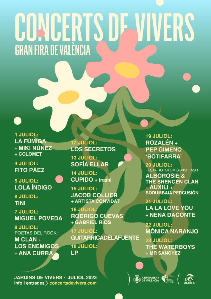 Los Conciertos de Viveros se iniciarán el sábado 1 de julio con las actuaciones de La Fúmiga, Miki Núñez y Colomet. Los tres artistas ofrecerán una noche de sonidos festivos y bailables. El argentino Fito Páez llegará a València el martes 4 en el marco de la gira de celebración del 30º aniversario del disco El amor después del amor. Un día después, el miércoles 5, será el turno de la polifacética Lola Índigo, quien presentará el disco El dragón. Precisamente, Tini, artista que ha colaborado con Lola Índigo, cogerá el testigo de la madrileña el jueves 6 para demostrar por qué es una de las grandes figuras de los ritmos latinos actuales. Por otro lado, Miguel Poveda actuará el viernes 7 con el espectáculo Diverso, donde transita por el flamenco, el tango o la canción popular mexicana. El fin de semana se cerrará el sábado 8 de julio con la velada ‘Poetas del Rock’ con la presencia de las bandas M Clan, Los Enemigos y Ana Curra.
