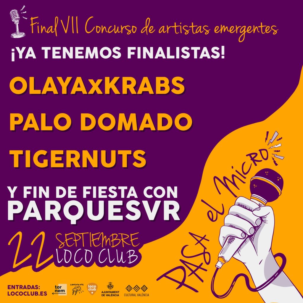 OlayaxKrabs, Palo Domado y Tigernuts son los elegidos para participar en la gran final de la séptima edición del concurso Pasa el Micro con Parquesvr como cabeza de cartel.