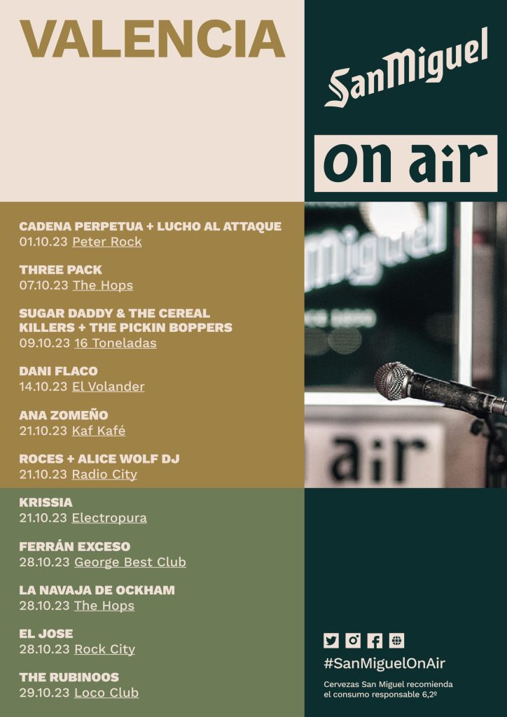 La emoción vuelve a llenar los escenarios, el ritmo regresa a las salas y la energía vuelve a inundar el ambiente. San Miguel On Air apuesta nuevamente por presentar actuaciones en directo en los lugares más emblemáticos de Valencia, en una nueva edición de su ciclo de conciertos. Bandas con personalidad y estilos distintivos conforman una programación que es absolutamente irresistible. Estamos a punto de comenzar un mes excepcional, con doce eventos imprescindibles que tendrán lugar en varias salas de conciertos de la ciudad.