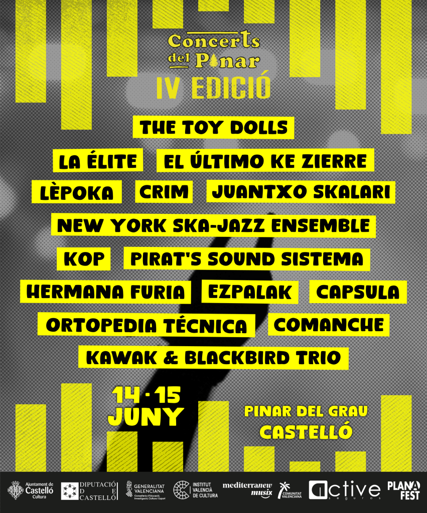 El festival Concerts del Pinar desvela su cartel completo encabezado por los ingleses The Toy Dolls. Asimismo, las nuevas confirmaciones de esta cuarta edición son Crimen, New York Ska Jazz Ensemble, Juancho Skalari, Pirat’s Sound Sistema, Comanche y Kawak & Blackbird Trio. Estos nombres acompañarán a los artistas confirmados el pasado 14 de febrero: EUKZ (El Último Ke Zierre), La Élite, Lépoka, KOP, Hermana Furia, Capsula, Ezpalak y Ortopedia Técnica. Con este cartel el festival ya está listo para conquistar el pinar del Grao de Castellón y sube el precio de sus entradas a 35€ el abono para los días 14 y 15 de junio. Las entradas están disponibles exclusivamente a través de Entradas Castellón y a través de la plataforma online de Notikumi .