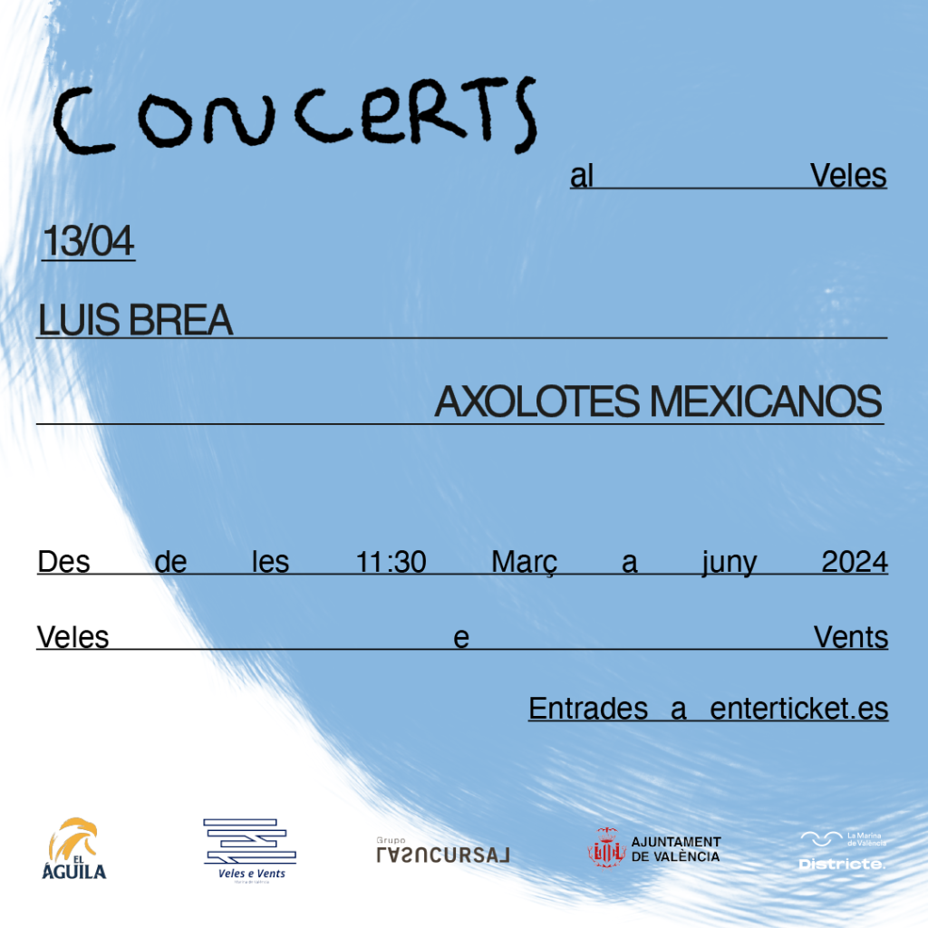 Concerts al Veles es el nuevo ciclo de conciertos que trae de vuelta la música a La Marina de València. Impulsado por la Agència Districte y el Grupo la Sucursal, y con el apoyo de Cerveza El Águila, el ciclo tiene lugar en la terraza de la primera planta del edificio Veles e Vents. En la tercera fecha del ciclo estarán sobre el escenario Luis Brea y Axolotes Mexicanos.