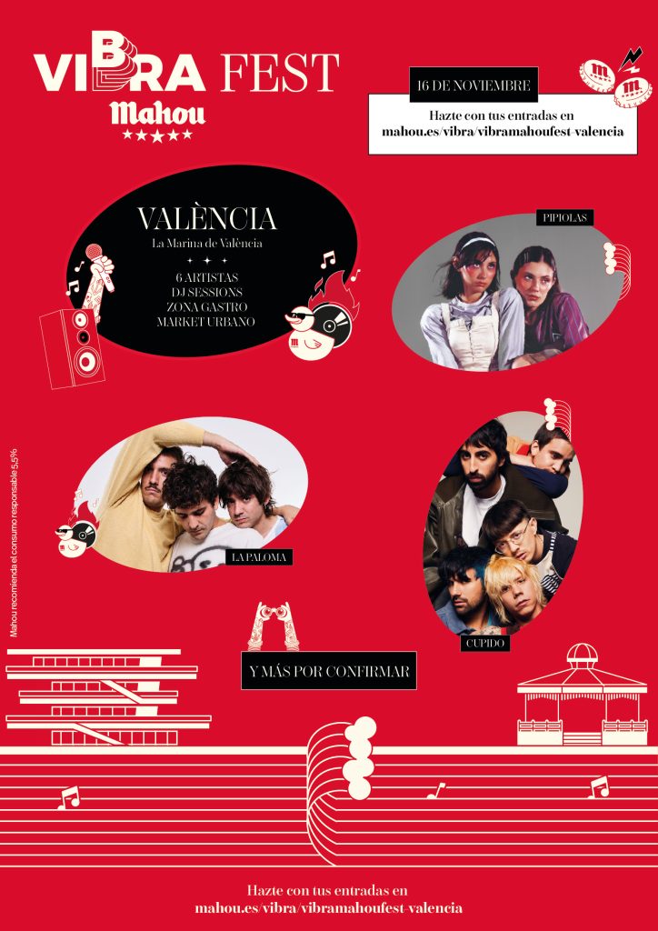 Después de conquistar al público valenciano en sus dos primeras ediciones, Vibra Mahou Fest regresa con más fuerza que nunca, consolidándose como uno de los eventos imprescindibles del calendario cultural de la ciudad. El próximo sábado 16 de noviembre, La Marina se llenará de música con la tercera edición del festival, que ya ha confirmado a Cupido, La Paloma y Pipiolas como los primeros nombres de su cartel. Con esta nueva propuesta, la plataforma musical de Mahou Cinco Estrellas continúa impulsando los mejores directos en la ciudad.