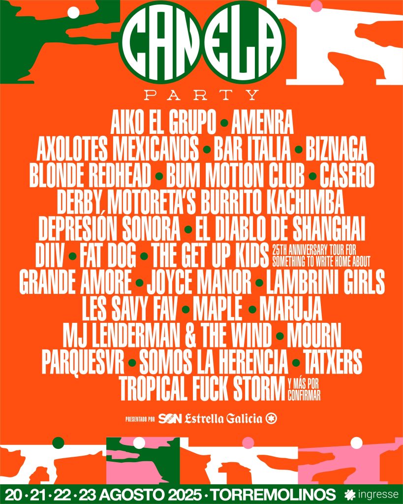 Recordemos que estos ocho nuevos artistas se suman a un ya más que abultado cartel para la 17ª de Canela Party. Desde el lado internacional, ya contábamos con nombres del calibre de Amenra, bar italia, Fat Dog, Joyce Manor, Les Savy Fav, Maruja, The Get Up Kids (celebrando, recordemos, los veinticinco años de un disco tan aplaudido como «Something To Write Home About») y Tropical Fuck Storm; y desde la cantera nacional, artistas como Aiko el Grupo, Axolotes Mexicanos, Bum Motion Club, Depresión Sonora, Derby Motoreta’s Burrito Kachimba, Grande Amore, Maple, Mourn, Parquesvr y Tatxers. ¡Ahí es nada!