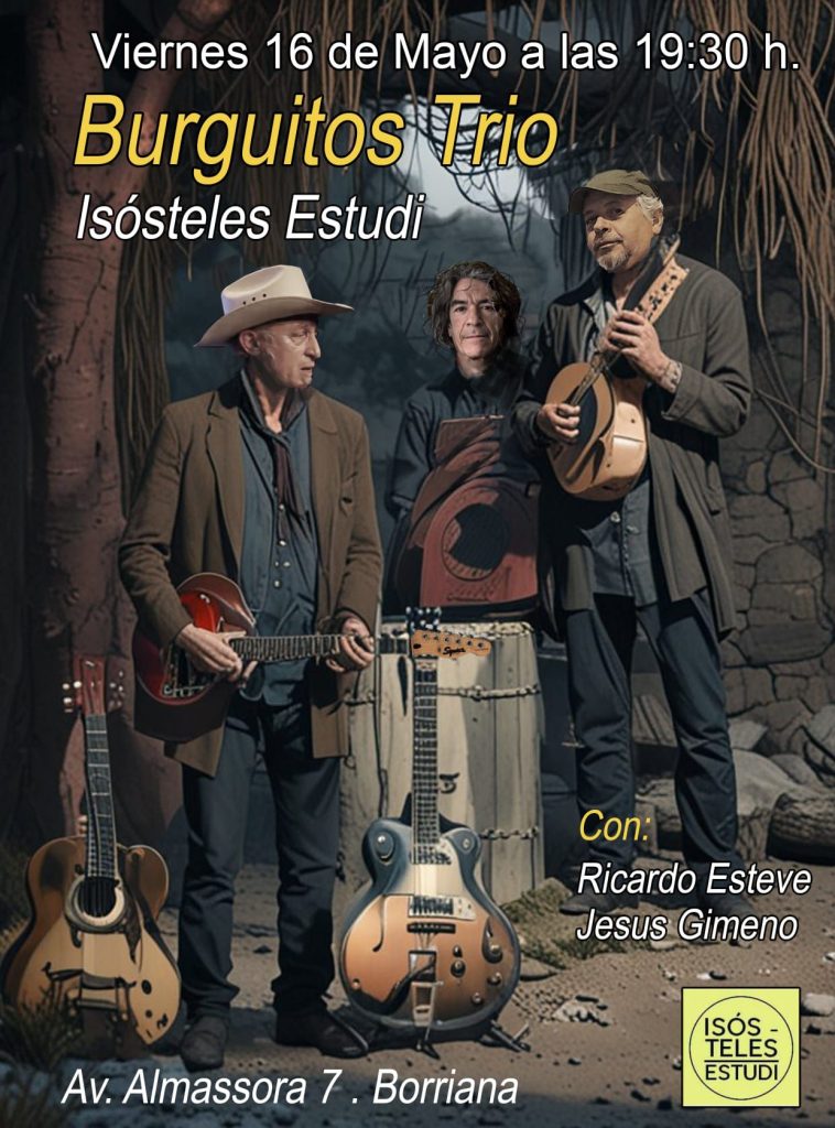 Este viernes 16, llegará a Isósteles Estudi el Burguitos Trío. Se trata del proyecto comandado por el polifacético artista Fernando Burgos, nombre importante dentro de la escena valenciana desde finales de los 80.  Sus letras urbanas están llenas de contenido social, a veces románticas, otras con gran sentido del humor. En directo se acentúa la faceta de entretenimiento por su faceta como showman. Le acompañan dos experimentados músicos, como son el guitarrista Ricardo Esteve y el batería Jesús Gimeno. A las 19:30, con taquilla inversa.