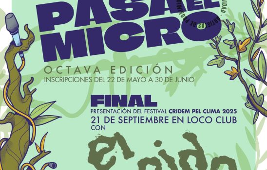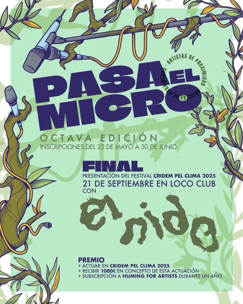 Tornem, Cultura i Sostenibilitat, proyecto de la Asociación Cultural La N Flotante, en su afán por promocionar la cultura musical emergente en la ciudad de València y en la Comunidad Valenciana pone en marcha la que será la octava edición del concurso Pasa el Micro. con la colaboración de Huming for Artists, Festival Cridem pel Clima, Cultural Valencia (Ayuntamiento de Valencia) , Institut Valencià de Cultura y Loco Club.