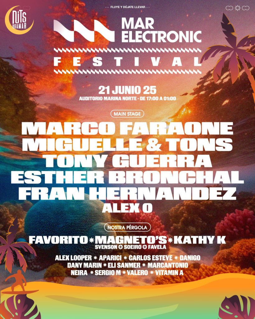 Durante la jornada del sábado 21 de junio , se podrá disfrutar desde las 17.00h de la tarde hasta la 1.00h de la madrugada de lo mejor de la escena groove electrónica en Mar Electrónic, donde se reunirán DJs internacionales y un soundsystem de alto nivel repartidos entre el escenario principal (Marco Faraone, Miguel y Tonos, Tony Pérgola (Favorito, Magneto’s-Svenson+Soeiro+Favela-, Kathy K, Alex Looper, Aparicio, Carlos Esteban, Danigo, Dani Marin, Eli Sanmer, Marcantonio, Neira, Sergio M, Valero y Vitamin A.
