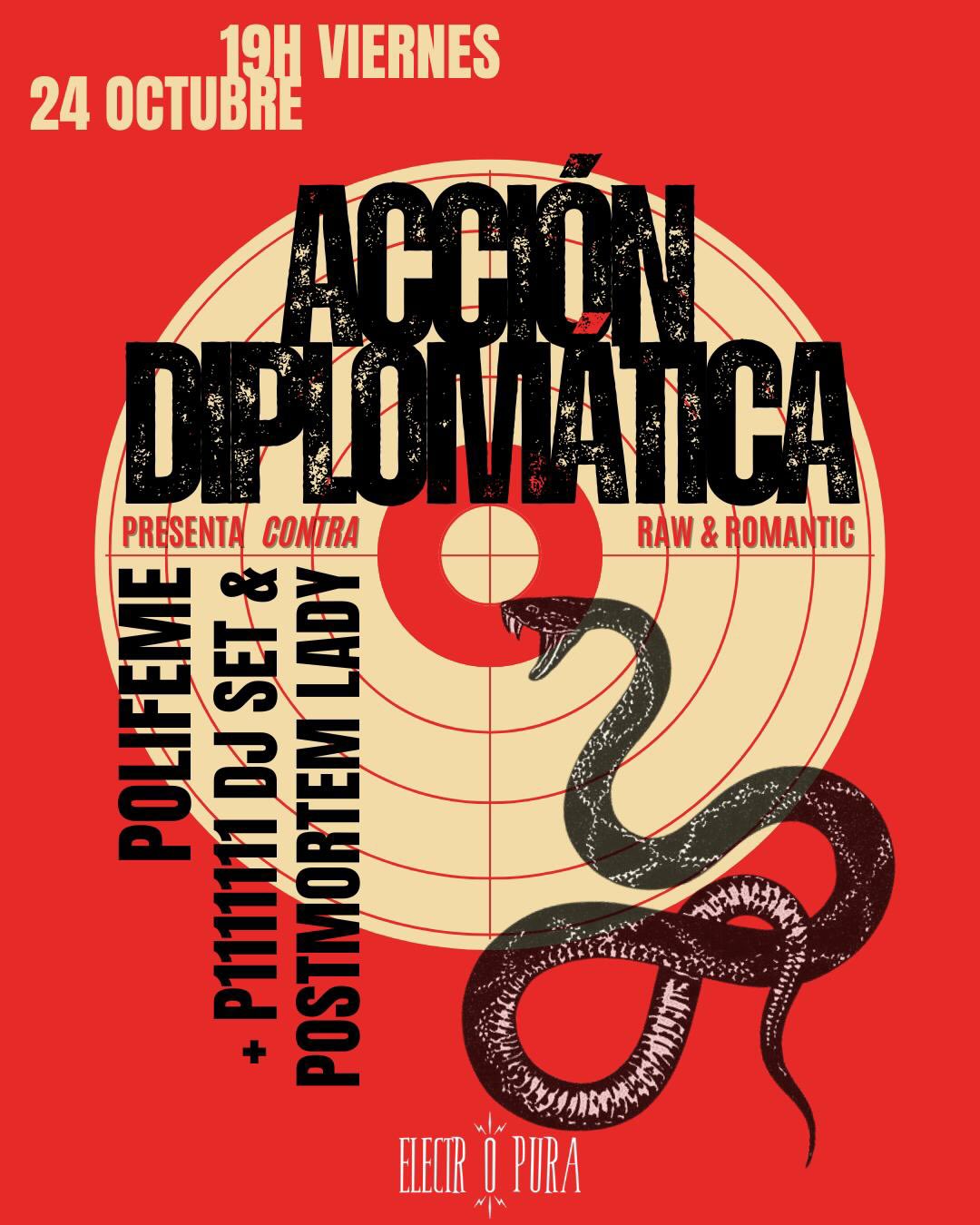 Acción Diplomática, el proyecto de Victor Hidalgo, ofrecerá un concierto el viernes 24 de octubre a las 19:00 horas en Electropura presentando «Contra», junto a Polifeme y el DJ set de P1111111 (Patricia Ferragud de La Plata) y Postmortem Lady (Mario Fuster de Anno Solar).