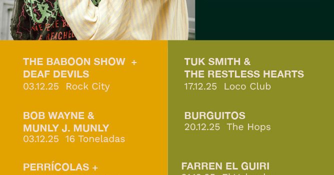 El mes arranca el 3 de diciembre con una doble cita: por un lado, The Baboon Show + Deaf Devils en Rock City, y por otro, Bob Wayne & Munly J Munly en 16 Toneladas, dos propuestas que representan la energía y eclecticismo del ciclo.