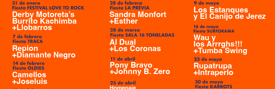 La programación del primer semestre de 2026 apuesta por una combinación equilibrada de bandas consolidadas, proyectos emergentes y fiestas temáticas, con estilos que van del rock y la psicodelia al pop, el folk, el garage o la electrónica. Tras la cita inaugural del 31 de enero, el calendario continuará con conciertos como Repion + Diamante Negro (7 de febrero), Camellos + Joseluis (14 de febrero), Aurora & The Betrayers + Helen Helen (21 de febrero) o Sandra Monfort + Esther (28 de febrero).