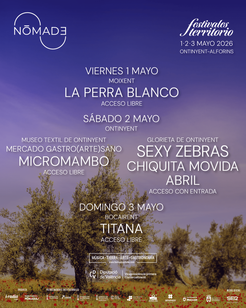 El cartel musical por días se completa con conciertos de acceso libre en otros espacios singulares del territorio, como La Perra Blanco en Moixent el 1 de mayo, Micromambo, grupo encabezado por Depedro, en Ontinyent dentro del Mercado Gastro(Arte)Sano el 2 de mayo y La Titana en Bocairent el 3 de mayo. De este modo, Nómade refuerza una propuesta que se aleja del formato convencional para invitar al público a recorrer el territorio a través de una programación distribuida, diversa y estrechamente vinculada a cada lugar.