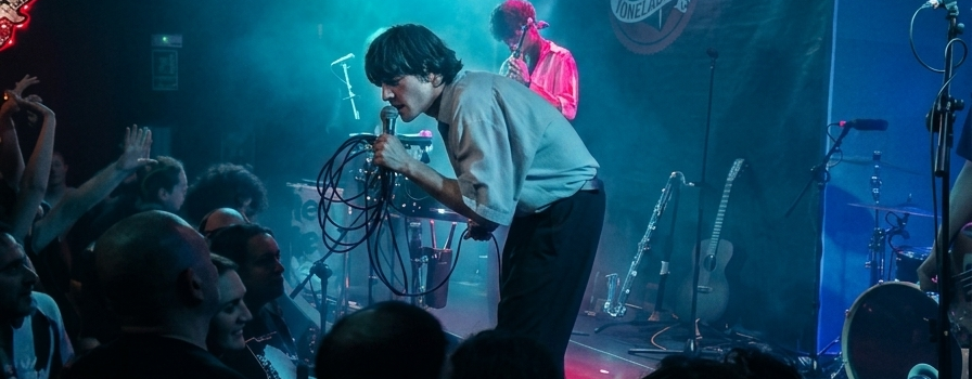 La noche arrancó con los compases enigmáticos de «Purity I». El vocalista, Zac Lawrence, nos sumerge en una atmósfera densa, en un tema que habla de la necesidad de romper con un sistema que te mantiene alienado, para volver a una especie de “pureza” esencial. Para demostrar su intención de conectar con el público, baja del escenario a la pista para seguir cantando y fundirse con sus fieles. En «To The Brim» abordan la frustración de no tener nada auténtico que decir y, aun así, sentir una presión enorme por expresarse. Para este tema Zac Lawrence agarra la guitarra acústica, y el sonido del saxo comienza a planear por la sala, avisando del protagonismo que irá tomando durante la noche. Vuelven a su primer disco con «Mere Mortal», con ecos melódicos y rítmicos de Franz Ferdinand y Arctic Monkeys pero con su oscuro y frenético sello personal. El estribillo (“What’s a mere mortal to do?”) lo resume todo: ¿qué puede hacer alguien corriente frente a esa carga emocional y existencial? Nosotros, de momento, seguir bailando y disfrutando agradecidos de su música ante un Zac que pronuncia un escueto «Grasias Valensia«. Continúan avanzando por ese oscuro túnel con una luz al fondo que es su último disco, con «He, Himself, and Him» entre lo ‘spoken’ y lo cantado.