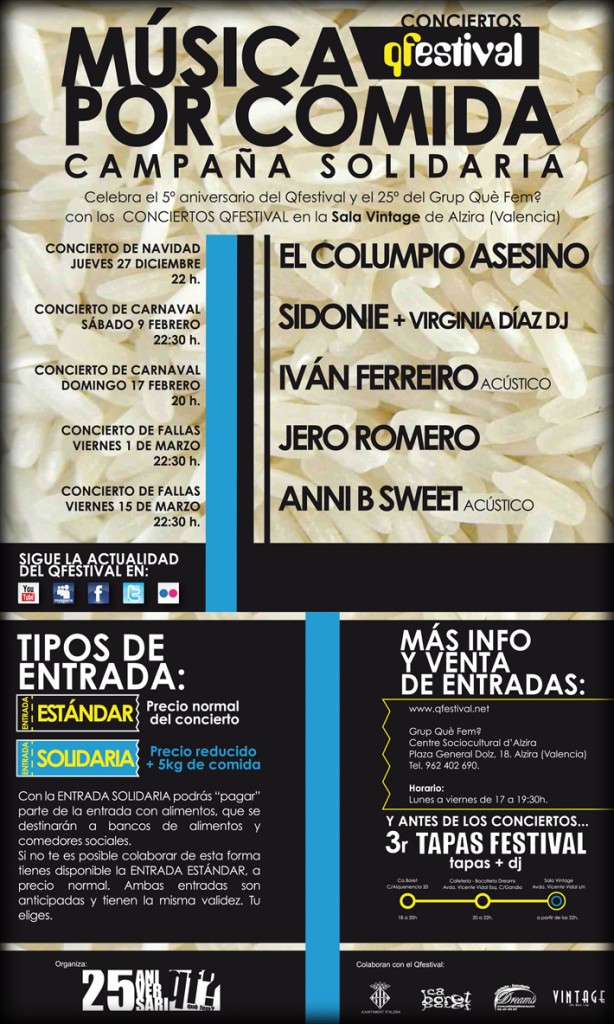 La campaña “Música por comida” se engloba dentro del quinto aniversario del Qfestival, y del 25 aniversario del Grup “Què Fem?” de Alzira, entidad promotora del festival. En la campaña “Música por comida” participan importantes artistas del panorama indie español como Iván Ferreiro, Sidonie, El Columpio Asesino, Annie B Sweet o Jero Romero, que se suman a la iniciativa del Grup “Què Fem?” realizando diferentes conciertos solidarios durante el primer trimestre del 2013, previos al Qfestival 2013 que tendrá lugar cerca del verano.