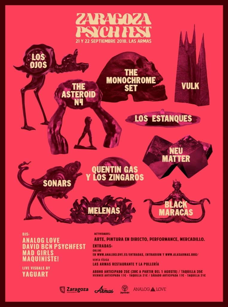 La representación de Analog Love Records serán Los Ojos (Zaragoza) y Neu Matter (Madrid). Los locales Los Ojos, tras compartir split con Velcoro, dar varios conciertos en el resto del país y ser finalistas de concursos como Proyecto Demo o Ambar Z Music, llegarán al Zaragoza Psych Fest para demostrar que ya son una realidad y enseñarnos su potente directo. Por su parte, Neu Matter es uno de las joyas escondidas tras varias capas de sedimento de la escena psicodélica nacional. Su música mezcla elementos de la dark psychdelia, el shoegaze, el noise o el spoken-word; generando un sonido oscuro y profundo que sale directamente del alma.