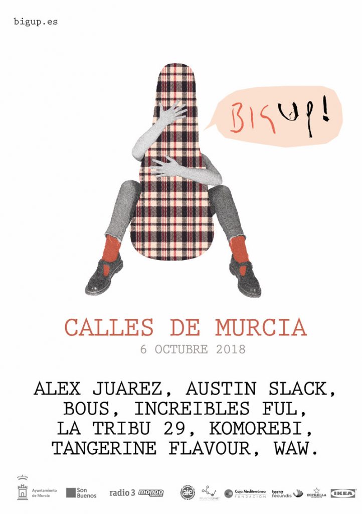 Big Up! Calles de Murcia 2018 contará con la desnudez lírica e instrumental, revisada desde una óptica contemporánea, en clave de post folk o electrónica narrativa de Alex Juarez. La elegante y virtuosa guitarra de rock and roll y blues de Austin Slack, el joven “ niño magnético” de tan solo 20 años, que ahora se enfrenta a temas propios, la voz maravillosa suave y frágil, sobre repeticiones rítmicas y atmósferas de los alicantinos Bous. La oscuridad y las canciones etéreas con letras profundas y melodías cálidas llenas de psicodelia y dream pop de Increíbles Full. El folk experimental que nace del deseo de dos violinistas de contar historias sonoras a través del ritmo y del uso de elementos electrónicos como loopers, pedales de efectos e instrumentos midi de Komorebi, ganadoras del CreaMurcia 2018. El rock más clásico y sonido americana que combina armonías vocales y melodías de country, soul y pop, de los madrileños Tangerine Flavour. La tradición flamenca y música mestiza con el ritmo del caribe, el funk y el jazz, en el directo desvergonzado y fresco de Tribu 29. El gamberrismo musical de rock enérgico y canciones con letras absurdas y divertidas en un directo en el que se une la performance y la maestría de los músicos de WAW, que juegan siempre a sorprender.