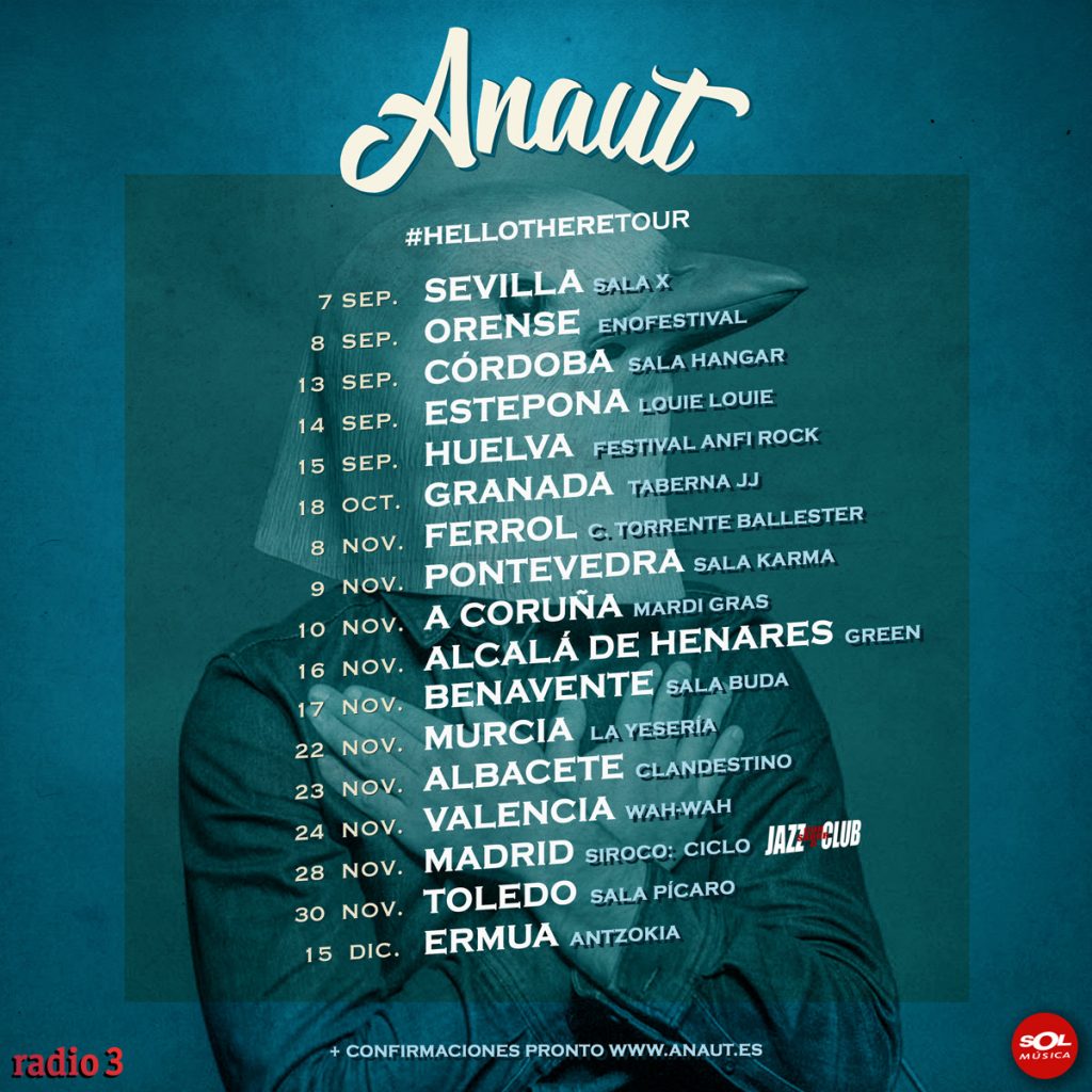 Sevilla, Ourense, Córdoba, Estepona, Huelva, Granada, Ferrol, Pontevedra, A Coruña, Alcalá de Henares, Benavente, Murcia, Albacete, Valencia, Madrid, Toledo y Ermua son los lugares en los que podremos ver el directo de Anaut en los próximos meses.