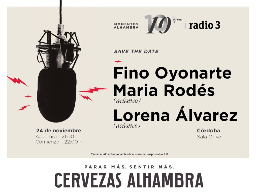 Nueva cita con Momentos Alhambra 10 sobre 10. El ciclo de conciertos que organiza Cervezas Alhambra, en colaboración con Radio 3, llega este mes a Córdoba con un cartel único: Fino Oyonarte, María Rodés y Lorena Álvarez serán los protagonistas de una noche irrepetible, el sábado 24 de noviembre en la Sala Orive.