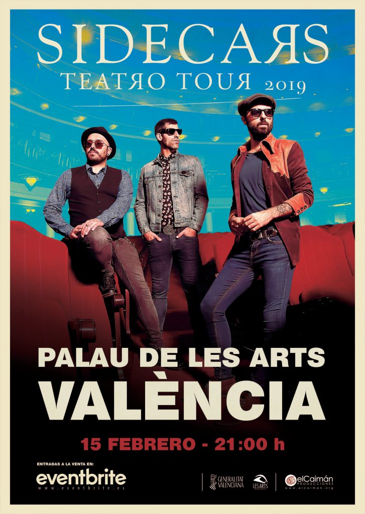 La banda madrileña Sidecars, una de las formaciones más importantes del pop-rock estatal, actuará en el Palau de les Arts Reina Sofía de València el viernes 15 de febrero. El concierto forma parte de la gira estatal por teatros y auditorios que empezará el 20 de enero en Bilbao y que también pasará por las ciudades de Madrid, Badajoz, Palma de Mallorca, Zaragoza, Gijón y Barcelona, entre otras.