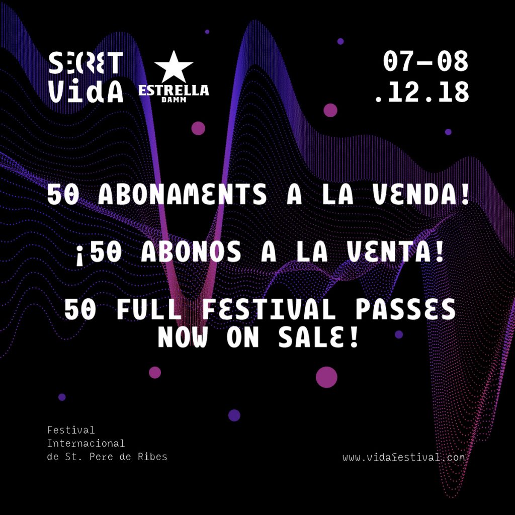 Debido al gran número de peticiones de todos los que se quedaron sin el abono del Secret VIDA, la organización del festival ha estado trabajando todo este tiempo para habilitar una nueva zona en la Finca Mas Solers y, gracias a eso, pueden ampliar el aforo en 50 personas. ¡Estos abonos están a la venta a 65€ desde ahora mismo hasta fin de existencias!