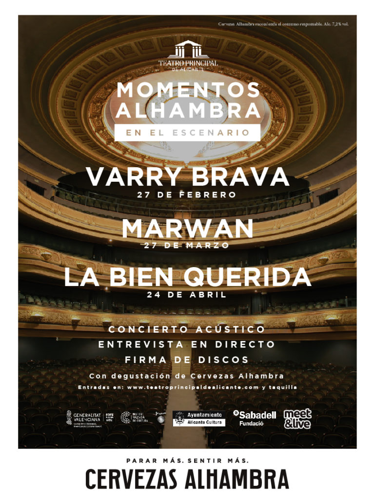 Tras la gran acogida por parte del público alicantino, el ciclo de conciertos acústicos ‘Momentos Alhambra en el Escenario’ regresa al Teatro Principal de Alicante el próximo 27 de febrero. Durante 2018 la programación estuvo repleta de grandes talentos musicales. Soleá Morente, Rufus T. FireFly, Niños Mutantes, Funambulistas, Anni B Sweet, Neuman y Morgan interpretaron sus canciones muy cerca de un público que les acompañó sobre el mismo escenario. Una experiencia musical única y exclusiva de la mano de Cervezas Alhambra que permitió a los asistentes disfrutar de un concierto íntimo y cercano.
