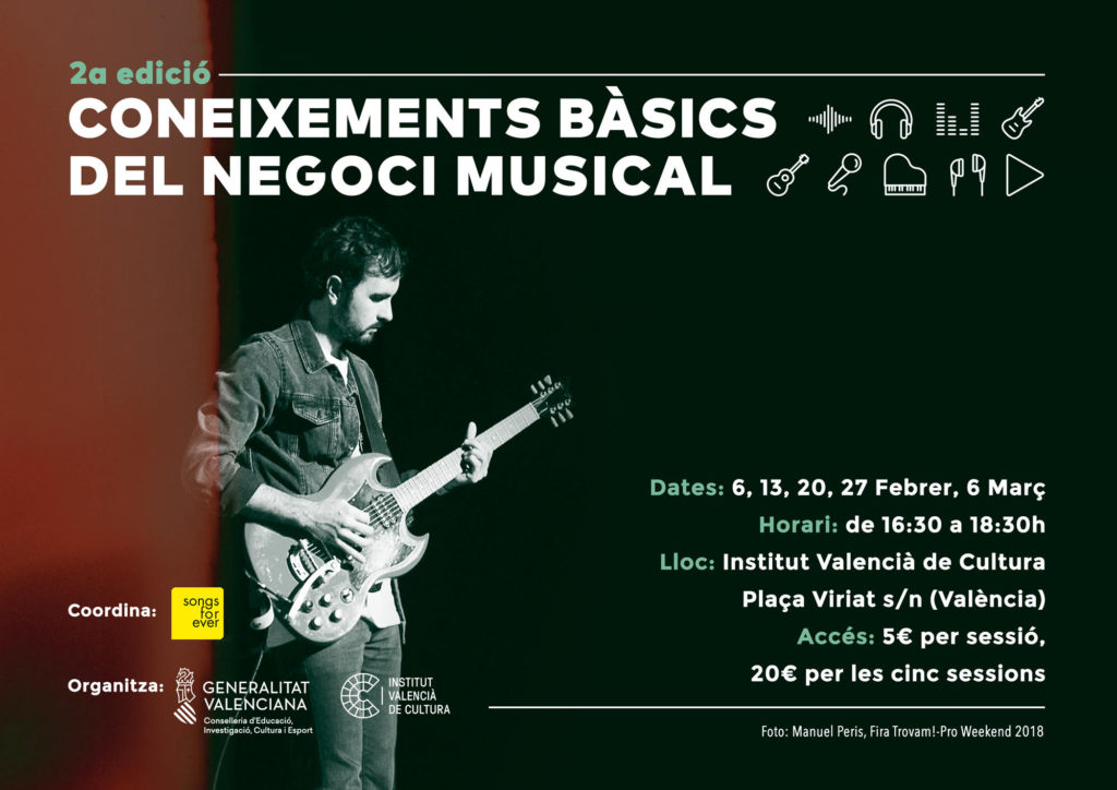 La dirección adjunta de música y cultura popular valenciana del Institut Valencià de Cultura (IVC) organiza en colaboración con Songsforever la segunda edición del ciclo «Conocimientos básicos del negocio musical» dirigido a artistas, músicos, compositores, managers y promotores musicales..
