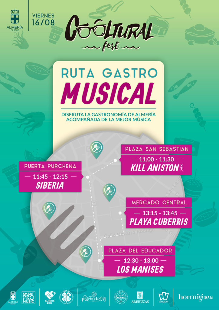 La ruta gastromusical se suma a las actividades complementarias de Cooltural Fest, con la colaboración de la Asociación Provincial de Empresarios de Hostelería de Almería (ASHAL). Serán cuatro conciertos que se sucederán en el tiempo en distintos emplazamientos del centro de la ciudad para animar a los ‘coolters’ a que conozcan los bares de la zona mientras escuchan la música en directo. Una buena manera de difundir las bondades culinarias que han hecho de Almería la capital gastronómica en este 2019.