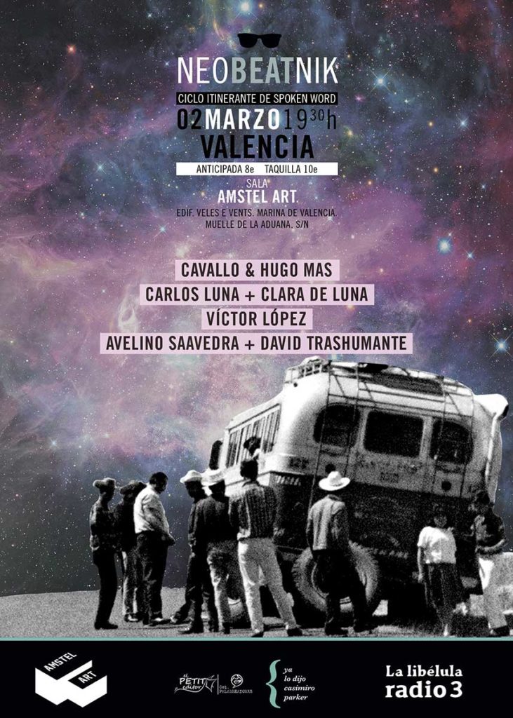 La furgoneta beat llega el próximo sábado 2 de marzo, a las 19:30 horas a la sala Amstel Art situada en la planta 0 del Edifico Veles e Vents del puerto de València, para ofrecer Neobeatnik, un recital-concierto en el que se presentarán los nuevos trabajos de Víctor López, David Trashumante + Avelino Saavedra y Carlos Luna + Clara de Luna. Además, contará con la participación del grupo valenciano de spoken word Cavallo, integrado por Hugo Mas, Pep Ahuir, Elies Fuster y Alan Welch.