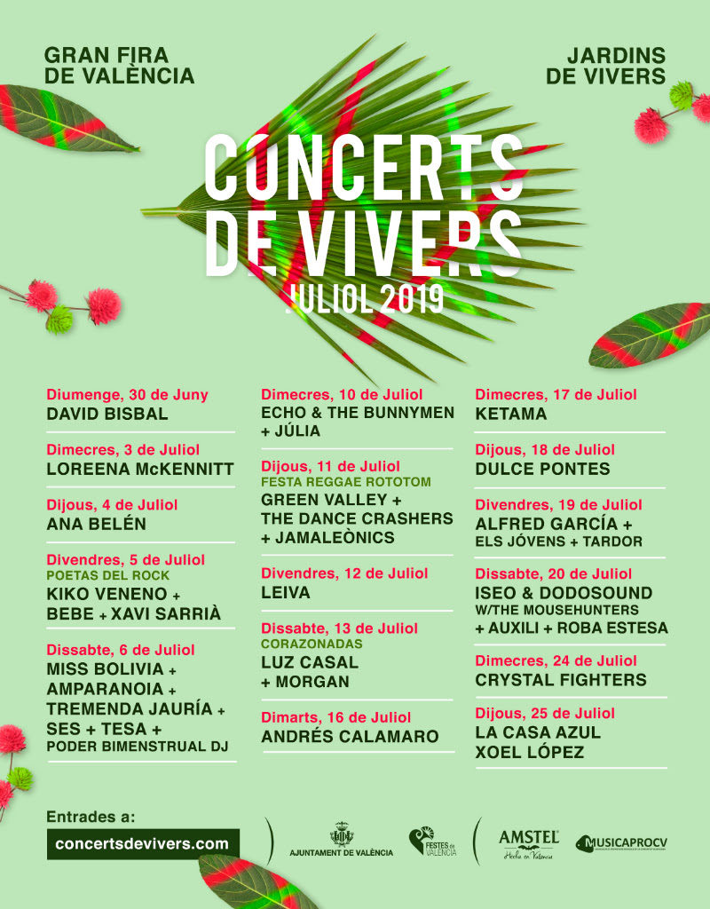 El argentino Andrés Calamaro actuará otra vez en los Jardines del Real (ya lo hizo en 2011) el martes, 16 de julio, con nuevo disco bajo el brazo: Cargar la suerte. Un día después será el turno de Ketama, formación que se ha reunido 14 años después de su separación y que está festejando la reedición de uno de sus álbumes más conocidos, De akí a Ketama (1995). El jueves, 18 de julio, los Conciertos de Viveros recibirán la visita de Dulce Pontes, una de las voces más reconocidas de la canción portuguesa. Alfred García, finalista de Operación Triunfo 2017 y representante español en Eurovisión 2018 (juntamente con Amaia), actuará en València el viernes, 19 de julio. Lo hará con la compañía de los valencianos Els Jóvens y Tardor. Los ritmos jamaicanos volverán a ser protagonistas el sábado, 20 de julio, con Iseo & Dodosound with The Mousehunters, Auxili y Roba Estesa.
