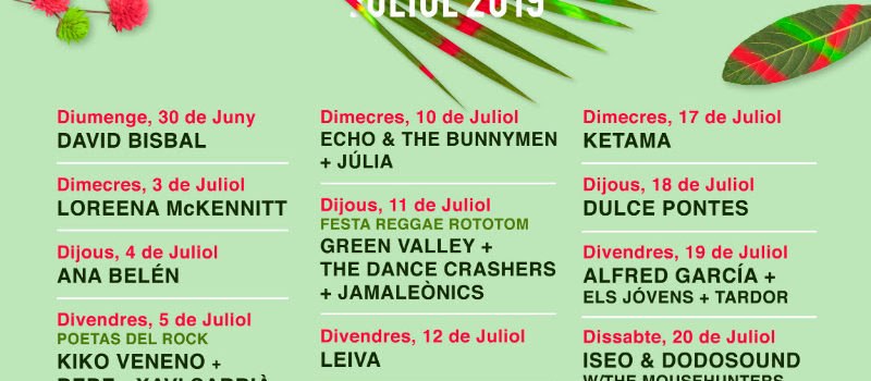 Un día después, el viernes 5, tendrá lugar el espectáculo ‘Poetas del rock’ con la presencia de Kiko Veneno, que publicará Sombrero roto en abril; Bebe, con su fusión de canción melódica y rumba; y Xavi Sarrià, excantante de Obrint Pas que debutó en solitario en 2017 con el disco Amb l’esperança entre les dents. El sábado, 6 de julio, el público podrá disfrutar con las voces femeninas de Miss Bolivia, Amparanoia, Tremenda Jauría, Ses, Tesa y Poder Bimenstrual Dj.