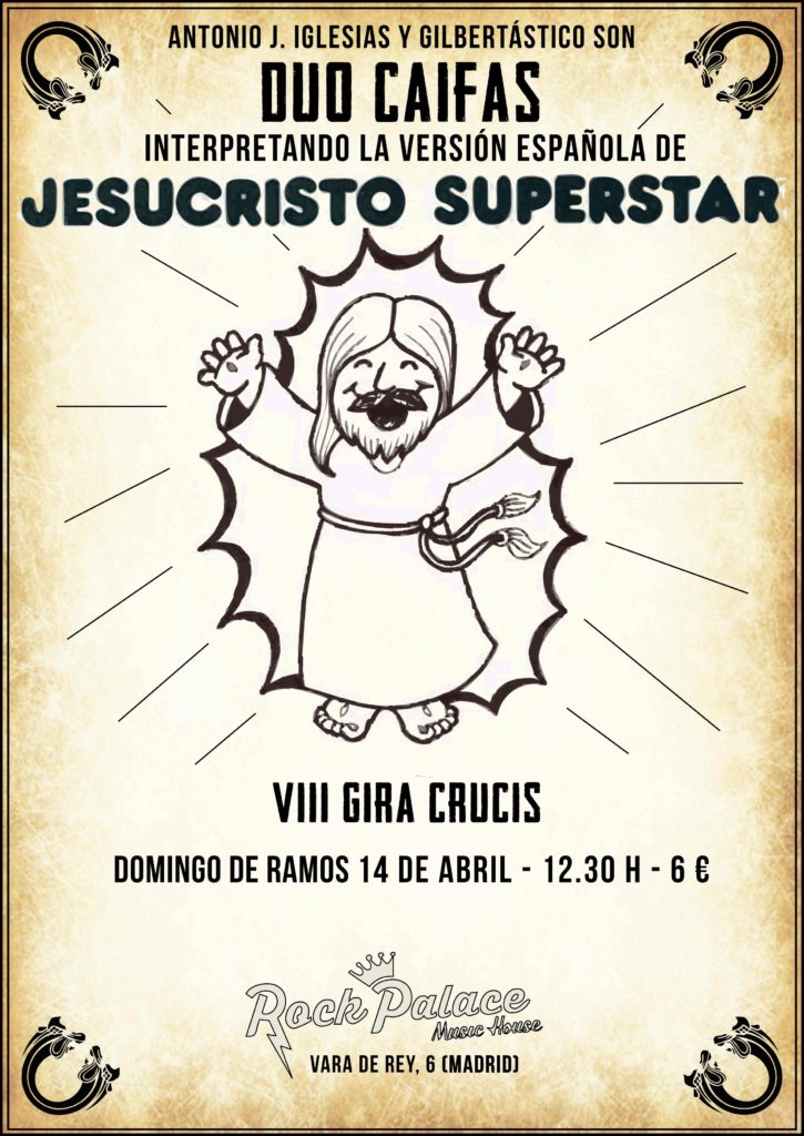 Antonio J. Iglesias (Dwomo, Le Grand Miércoles) y Gilbertástico tomaron por costumbre, hace ya 8 años, de interpretar sólo entre dos personas uno de los musicales más exitosos de la historia reciente: Jesucristo Superstar, el clásico de Andrew Lloyd Webber y Tim Rice, pero en la versión que en el año 72 apareció en España y en la que cantaban Camilo Sesto (Jesús) Teddy Bautista (Judas) o Ángela Carrasco (María Magdalena). El resultado es un recorrido por estas composiciones en versión reducida (piano, batería y voces) pero que mantiene intacto todo el mensaje original, alejándolo del fasto de la superproducción y concentrando su energía en la esencia de la propia obra.