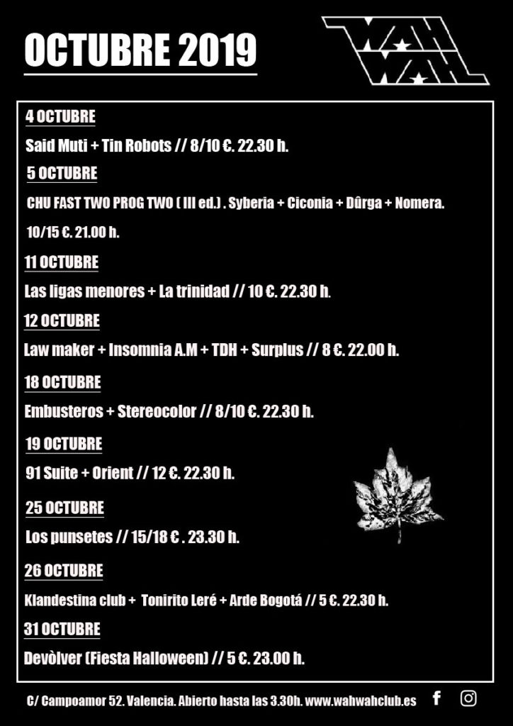 Os ofrecemos la programación musical de Sala Wah Wah para Octubre de 2019, que nos traerá el festival Chu Fast Two Prog en el que destacan la actuaciones de Dûrga y Nomera. También resulta interesante la visita de la banda argentina Las Ligas Menores o la irreverencia de Los Punsetes.