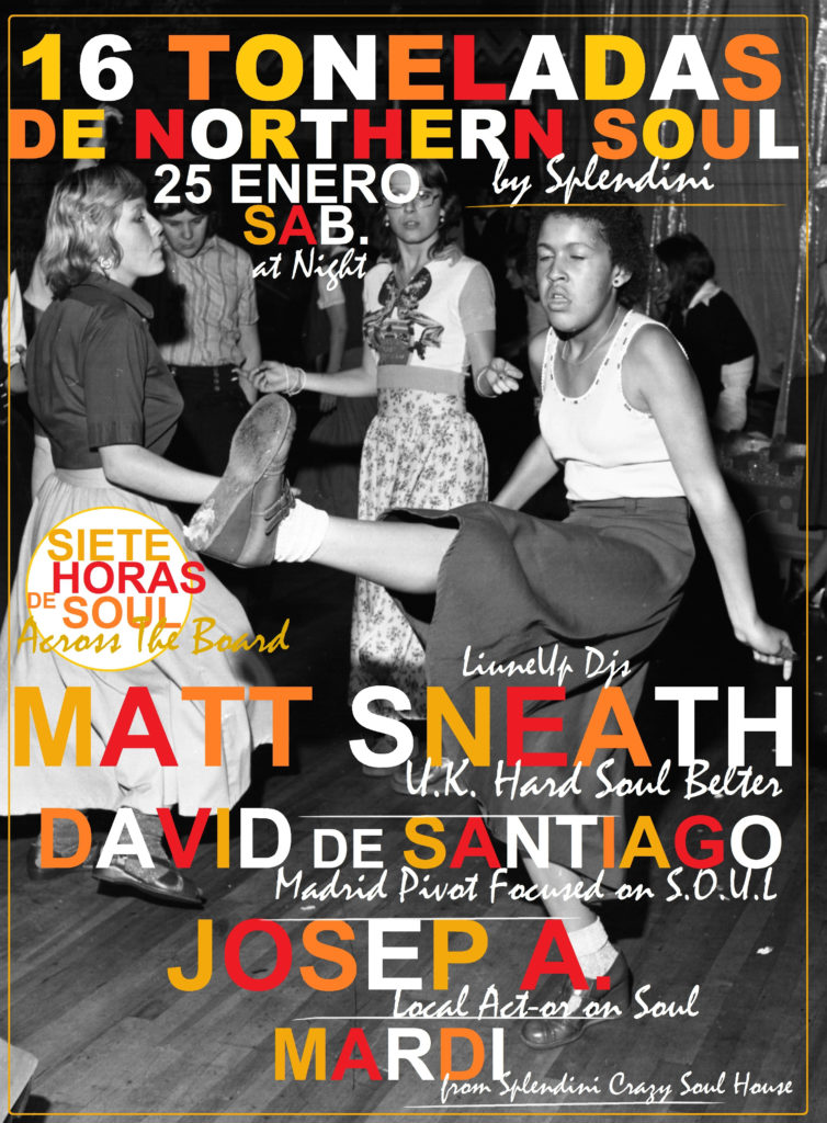 Splendini Bar y Discos, principales referentes de la música negra en la ciudad de València, organizan este sábado una gran fiesta Northern Soul en la sala 16 Toneladas (C/ Ricardo Mico, 3) a partir de las 23 horas y hasta que despunte el alba. Siete horas de baile y buena música, cuyo hilo conductor es la escena subcultural nacida en el Norte de Inglaterra a finales de los años sesenta. Este tipo de fiestas se caracterizan por sus bailes frenéticos y la devoción por los singles de 45 pulgadas producidos a lo largo de la década de los años sesenta por pequeños sellos independientes de soul clásico norteamericano. Canciones muy poco conocidas, que los jóvenes británicos -muchos de ellos pertenecientes a la escena mod- contribuyeron a popularizar a partir de los años setenta.