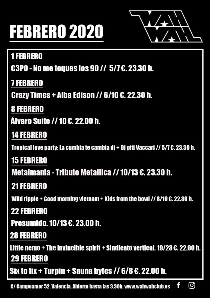 Os ofrecemos la programación de la sala Wah Wah para el mes de febrero que contará con la presentación del nuevo álbum de Wild Ripple, además de un concierto con bandas de los 80 como Little Nemo y The Invincible Spirit, acompañados por los alicantinos Sindicato Vertical.