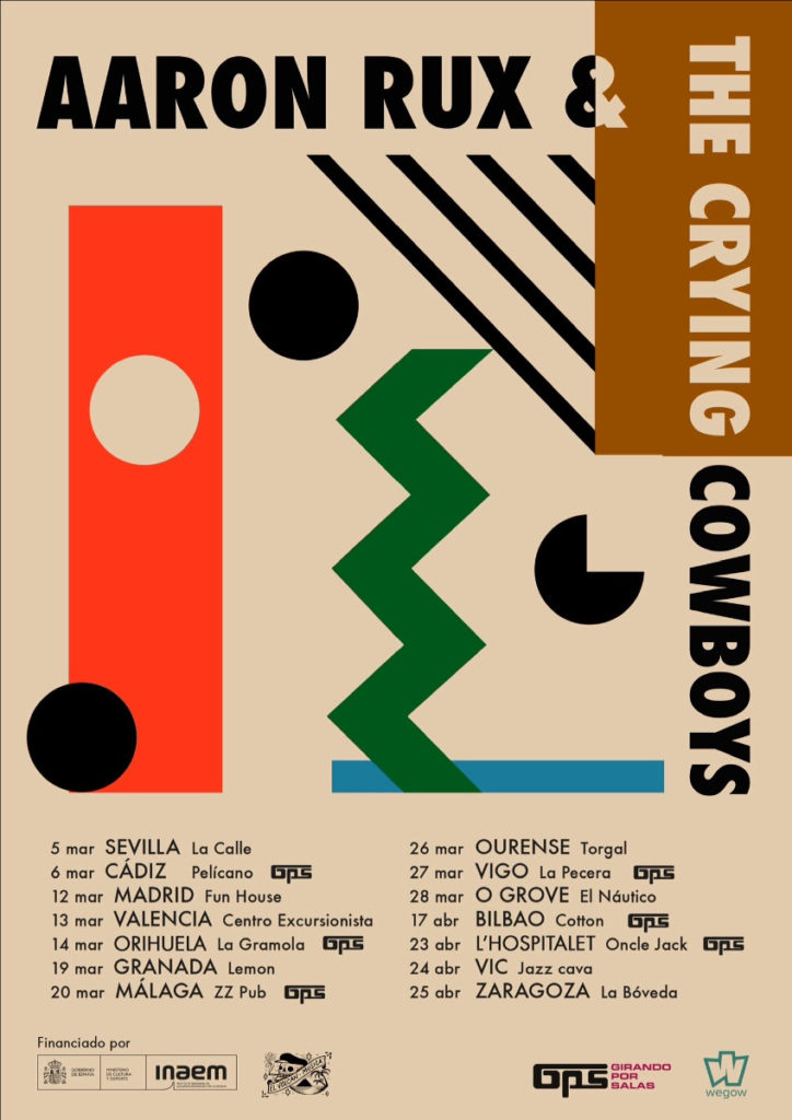 La banda fronteriza residente en Madrid, Aaron Rux & The Crying Cowboys, nos hará vibrar con su directo en seis conciertos, gracias a las ayudas de Girando Por Salas, y cabalgaran por: el Pelícano en Cádiz, la Gramola en Orihuela (Alicante), ZZ de Málaga, la Pecera de Vigo, Cotton Club de Bilbao, L’ Oncle Jack de L’Hospitalet de Llobregat (Barcelona)