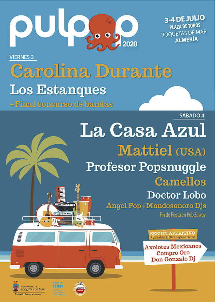 La organización del Pulpop Festival 2020 anuncia el cartel definitivo de la décimo sexta edición. Los madrileños Carolina Durante cerrarán la noche del viernes junto a Los Estanques y los finalistas del concurso de bandas «Andrés Reyes». La jornada del sábado comenzará con la actuación de Doctor Lobo, finalistas de concurso de bandas de la pasada edición, continuarán Camellos, los almerienses Profesor Popsnuggle y cerrando el cartel la norteamericana Mattiel y La Casa Azul.