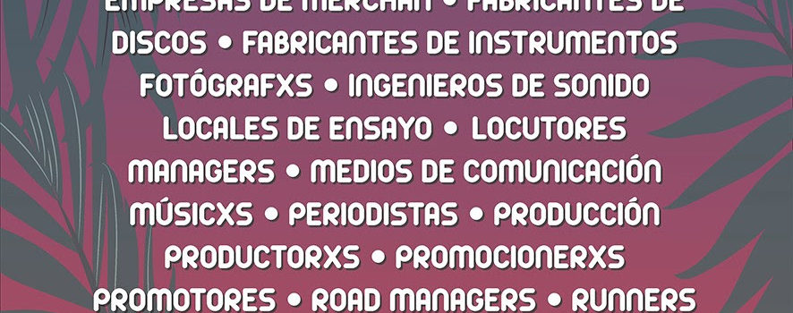 – Artistas, autores, backliners, bookers, discográficas, distribuidoras, DJs, editores, estudios de grabación, eléctricos, empresas de merchan, fabricantes de discos, fabricantes de instrumentos, fotógrafxs, ingenieros de sonido, locales de ensayo, locutores, managers, medios de comunicación, músicxs, periodistas, personal de producción, productorxs, promocionerxs, promotores, riggers, roadies, runners, salas de conciertos, stage managers, técnicxs de luces, técnicos de sonido, técnicos de vídeo, ticketeras, tiendas de discos, tiendas de instrumentos, tour managers, etc,