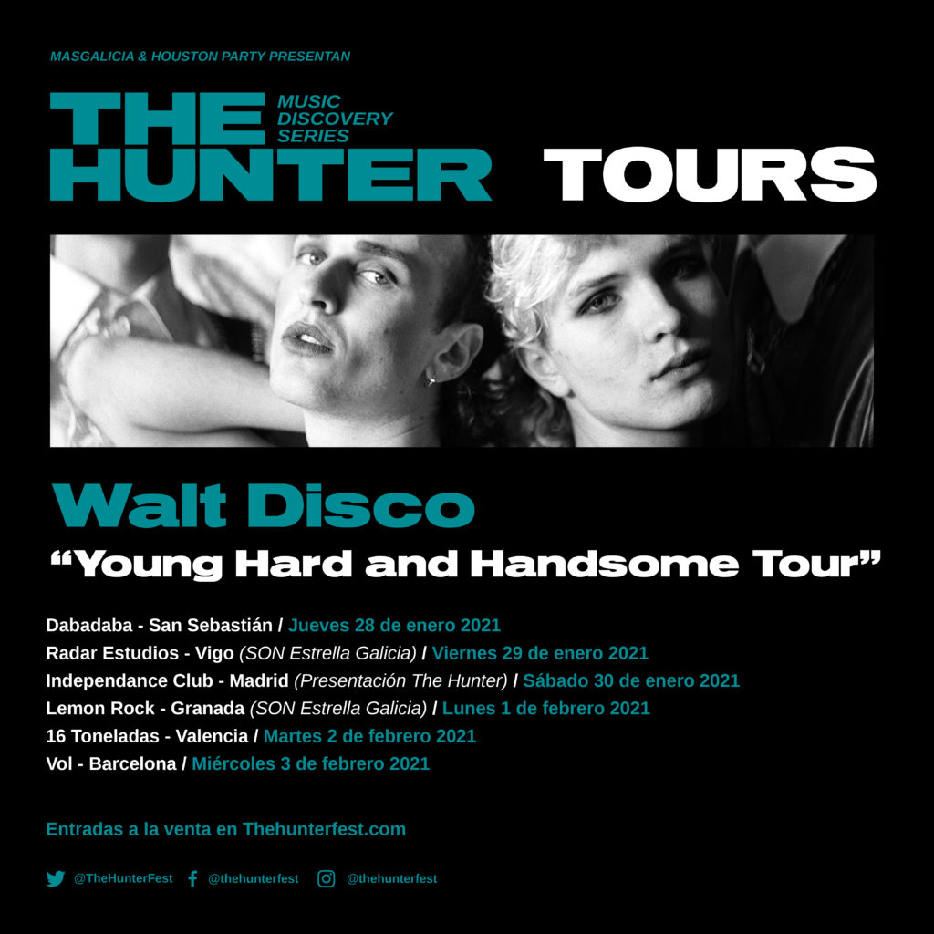 La banda escocesa Walt Disco actuará a principios del próximo año en San Sebastián (el 28 de enero, Dabadaba), Vigo (el 29, Radar Estudios, SON Estrella Galicia), Granada (el 1 de febrero, Lemon Rock, SON Estrella Galicia), Valencia (el 2, 16 Toneladas) y Barcelona (el 3, Vol), dentro de la que será la primera gira de The Hunter “Music Discovery Series”, el escaparate de artistas emergentes nacionales e internacionales que han creado conjuntamente Mas Galicia y Houston Party. Os recordamos que la fiesta de presentación de The Hunter tendrá lugar el 30 de enero de 2021 en la sala Independance Club de Madrid. Un evento en el que participarán más artistas, cuyos nombres se darán a conocer próximamente.