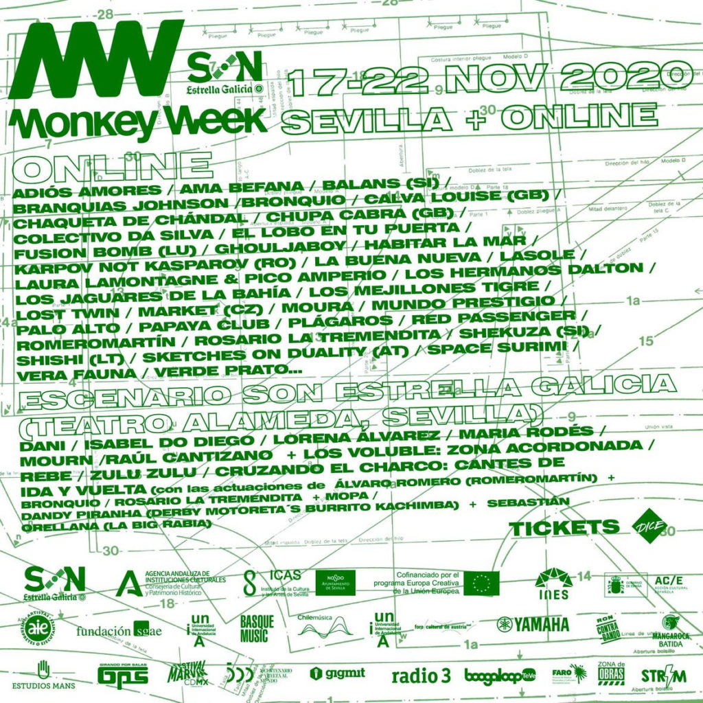 Recordemos que además de esta programación exclusivamente online, Monkey Week SON Estrella Galicia contará también del 17 al 22 de noviembre con una serie de conciertos presenciales, que se celebrarán en el Teatro Alameda de Sevilla -para un aforo reducido dadas las circunstancias actuales- y que serán retransmitidos en streaming. Los protagonistas de estos conciertos serán Dani, Isabel Do Diego, Lorena Álvarez, Maria Rodés, Mourn, Raúl Cantizano + Los Voluble: Zona Acordonada, rebe, Zulu Zulu, y el espectáculo especial «Cruzando el charco: Cantes de ida y vuelta» con las actuaciones de Álvaro Romero (RomeroMartín) & Bronquio; Rosario La Tremendita & Mopa; y Dandy Piranha (Derby Motoreta’s Burrito Kachimba) & Sebastián Orellana (La BIG Rabia). Las entradas para estos conciertos se encuentran disponibles a través de Dice.