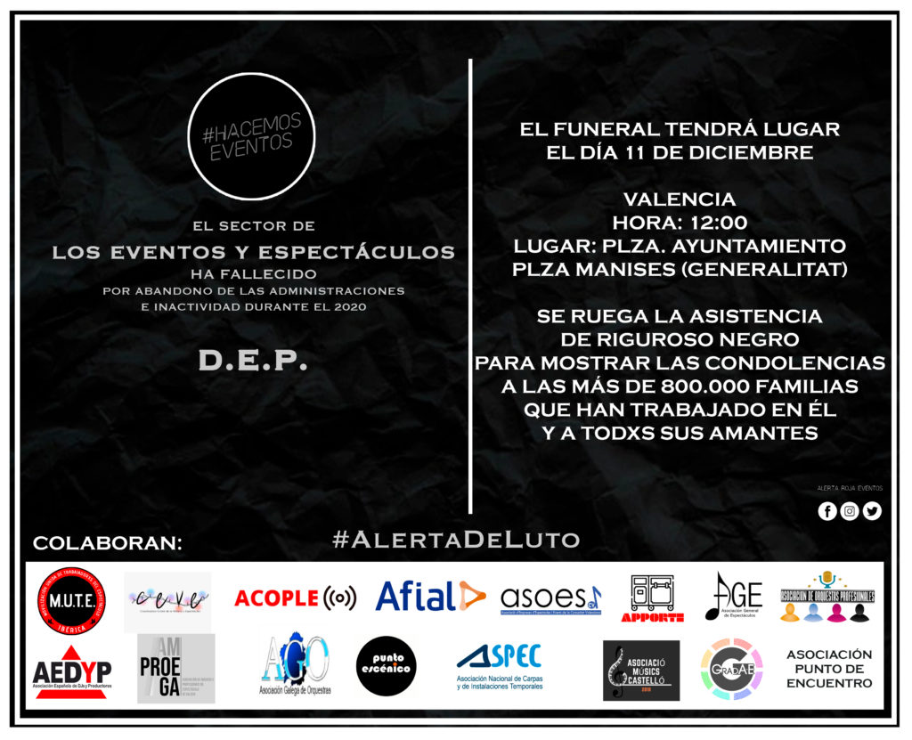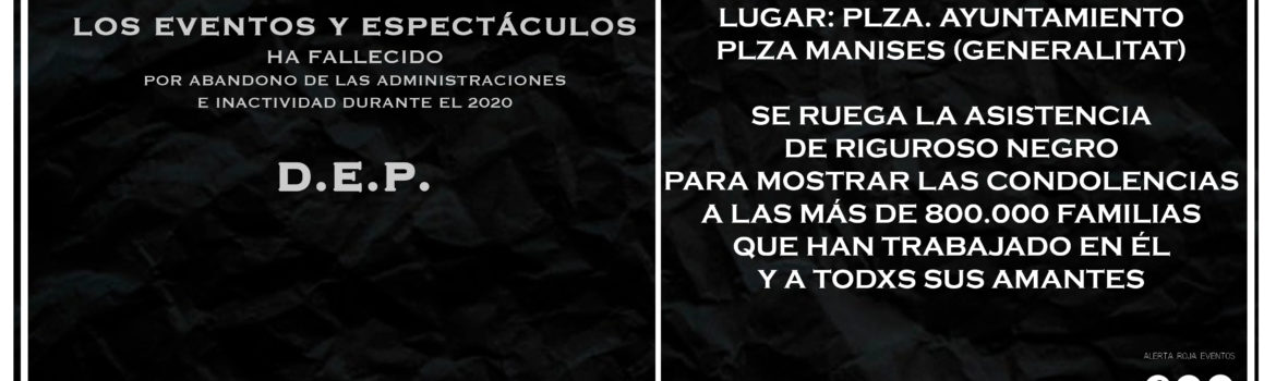 El movimiento Alerta Roja anuncia una nueva movilización el próximo 11 de diciembre por la agonía que padece el sector de Eventos y Espectáculos. “Hace ya más de 9 meses que la pandemia que arrasa el mundo entero estalló de lleno sobre nuestras vidas y nuestro sustento. Más de 9 meses viviendo en una agónica carrera de supervivencia que está poniendo en peligro la forma de vida de cientos de miles de familias del Sector de los Eventos y Espectáculos, de toda la cadena de valor”, han señalado portavoces de Alerta Roja.