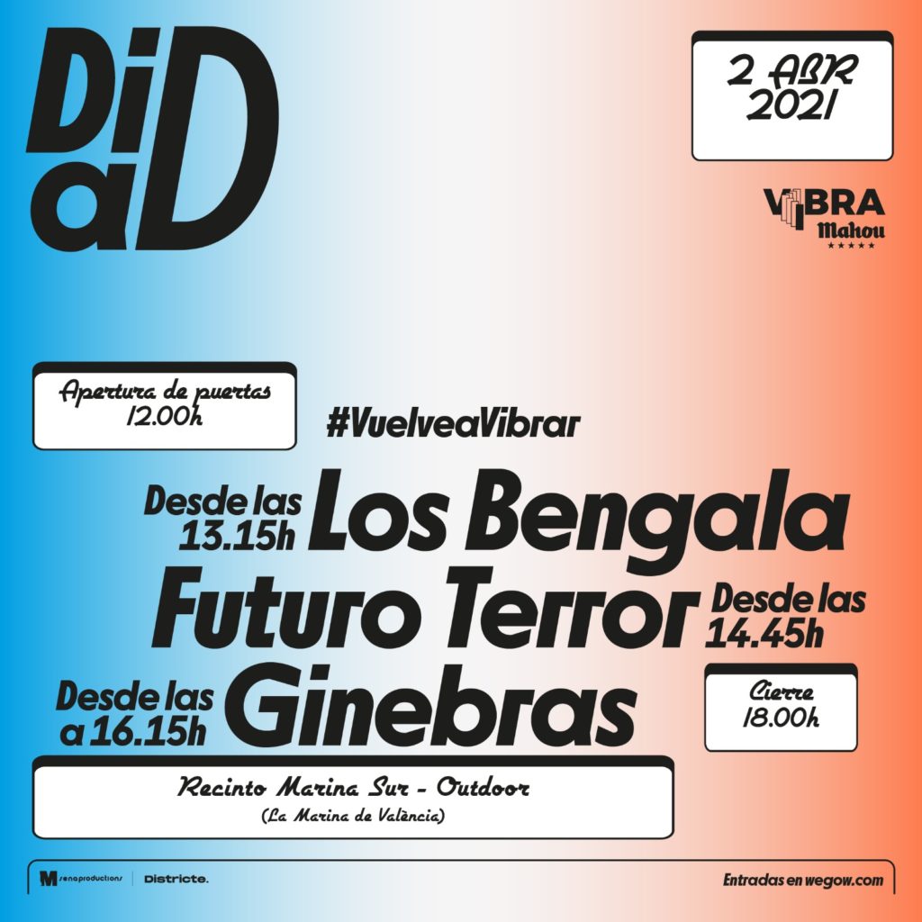 DiaD pone la nota musical a València esta Semana Santa, el viernes 2 de abril, con las actuaciones de Ginebras, Los Bengala y Futuro Terror en La Marina de València (recinto Marina Sur). Pegada, frescura y actitud son adjetivos comunes a los protagonistas de un cartel que lucirán sus mejores directos a plena luz del día. Vibra Mahou, la plataforma de música de Mahou Cinco Estrellas, vuelve a apoyar la iniciativa y consolida su apuesta por crear experiencias para generar encuentros en torno a la música en directo.