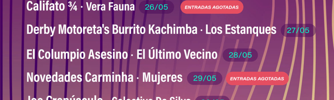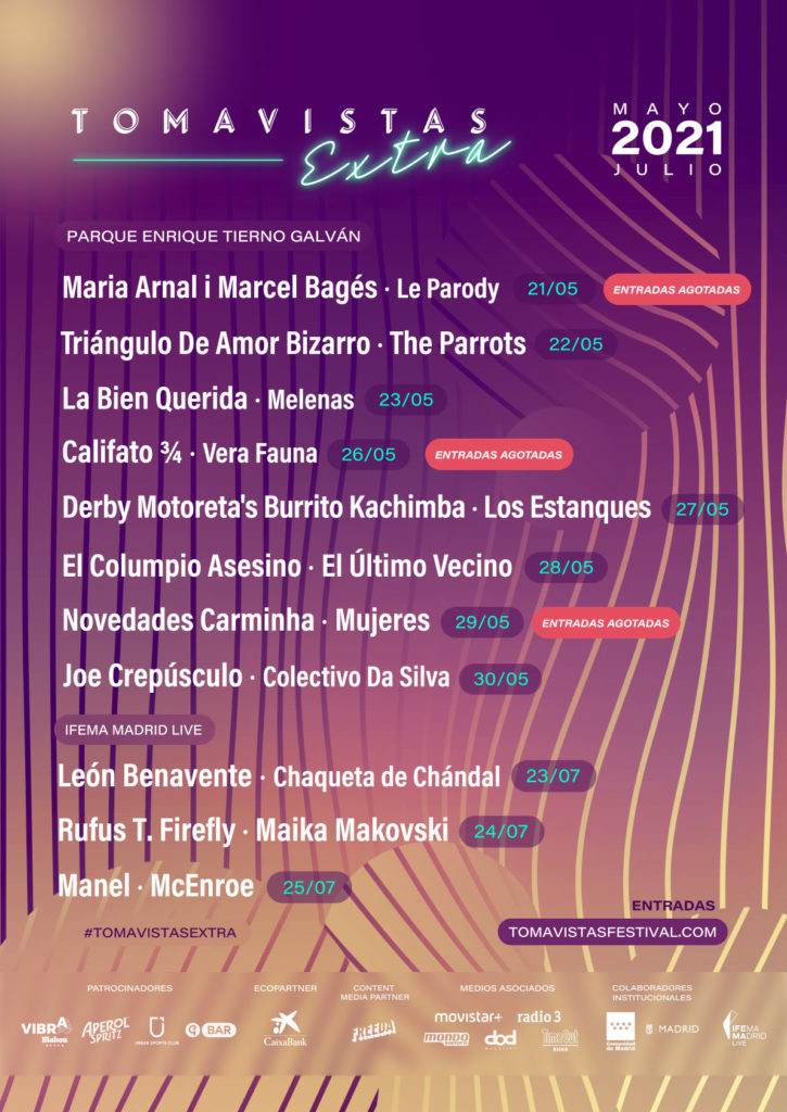 La segunda edición del ciclo Tomavistas Extra se inaugura el próximo 21 de mayo en el Parque Enrique Tierno Galván y ya tiene tres sold out en su haber: el de ese mismo 21 de mayo, para los conciertos de Maria Arnal i Marcel Bagès y Le Parody, el del 26 de mayo con Califato 3/4 y Vera Fauna, y el del 29 de mayo para las actuaciones de Novedades Carminha y Mujeres.